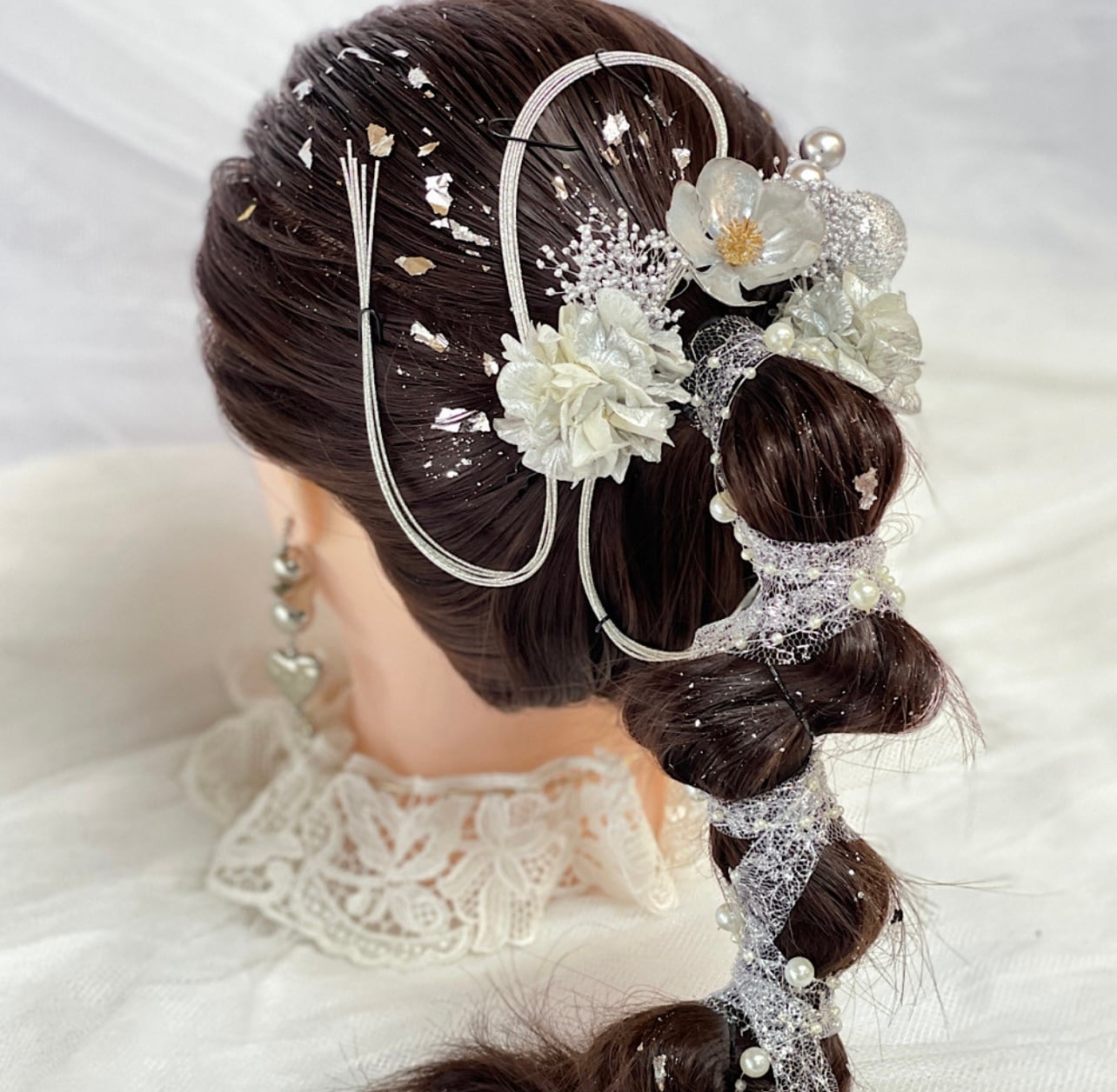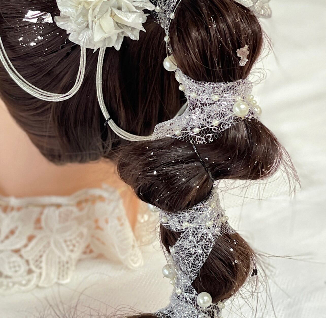 成人式 & 結婚式 シルバー パールとレースリボンの髪飾り 結婚式髪飾り 卒業式髪飾り 卒業式 水引き