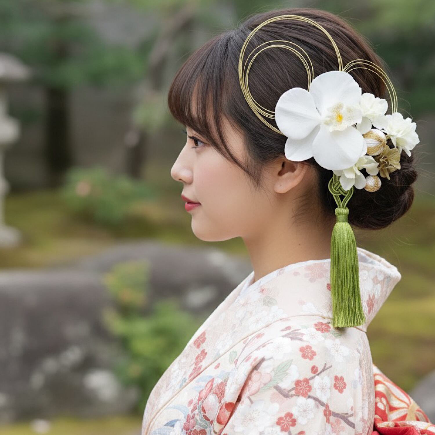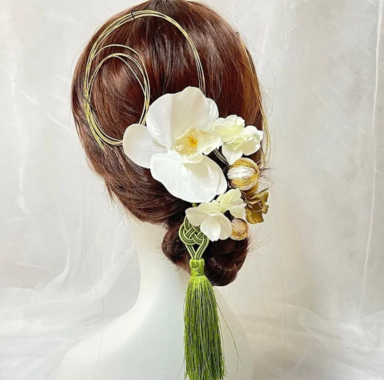 成人式 & 結婚式 グリーンミックスタッセル ホワイト胡蝶蘭髪飾り 水引きフラワー髪飾り 和装 卒業式 七五三 振袖 袴 緑