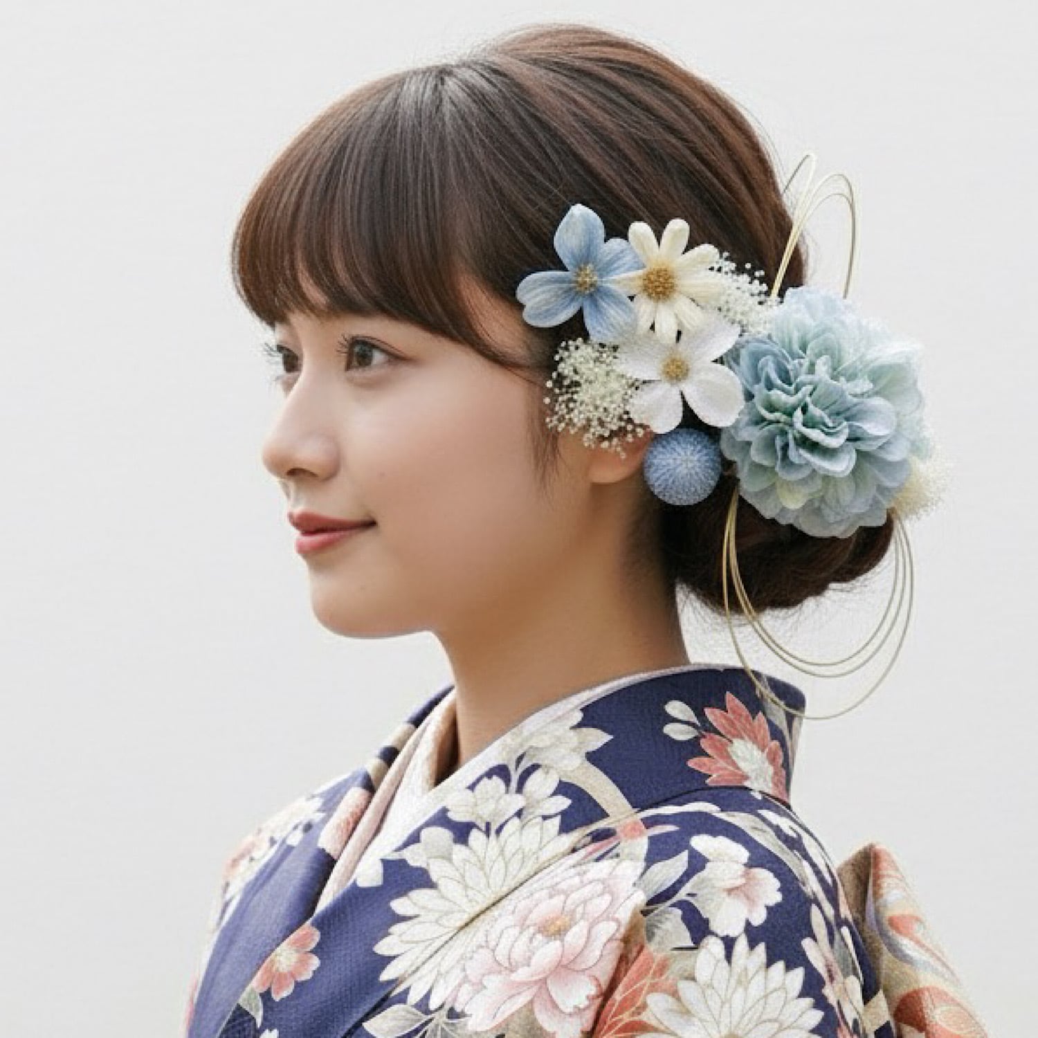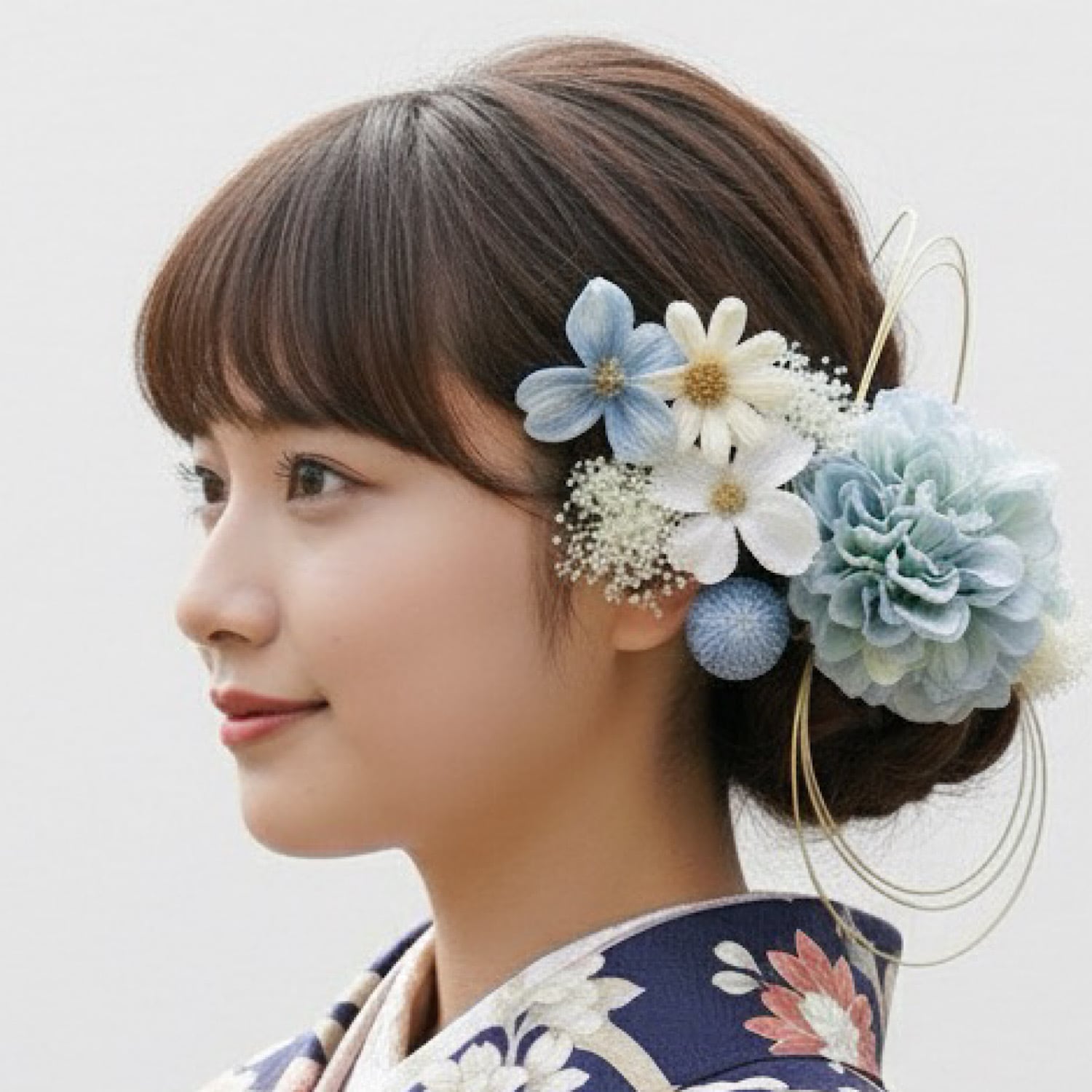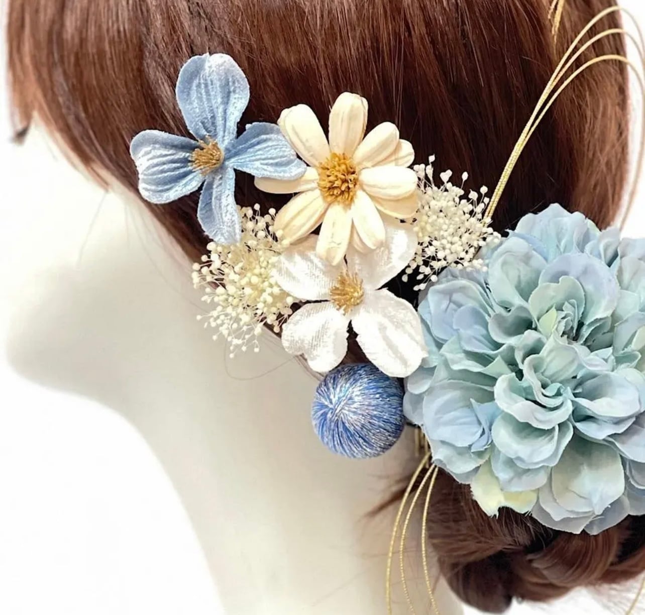 成人式 卒業式 結婚式 フラワーミックス髪飾り ブルーホワイトミックス 水引き髪飾り 二十歳の集い ヘッドパーツ 和装 卒業式髪飾り 七五三 ヘッドドレス