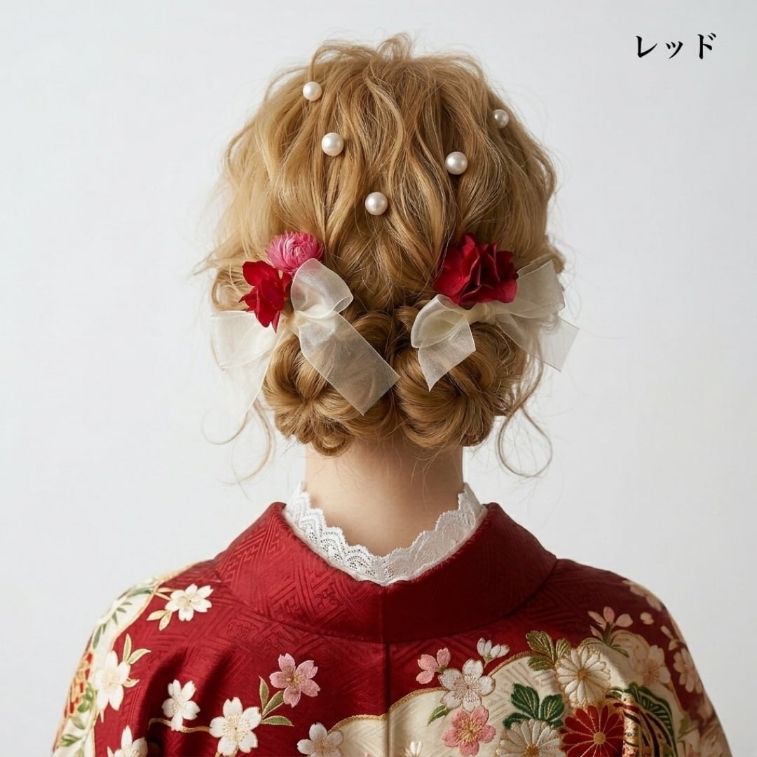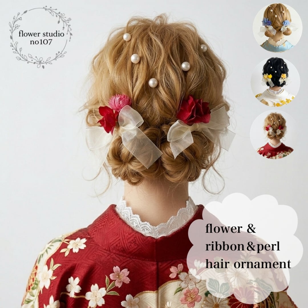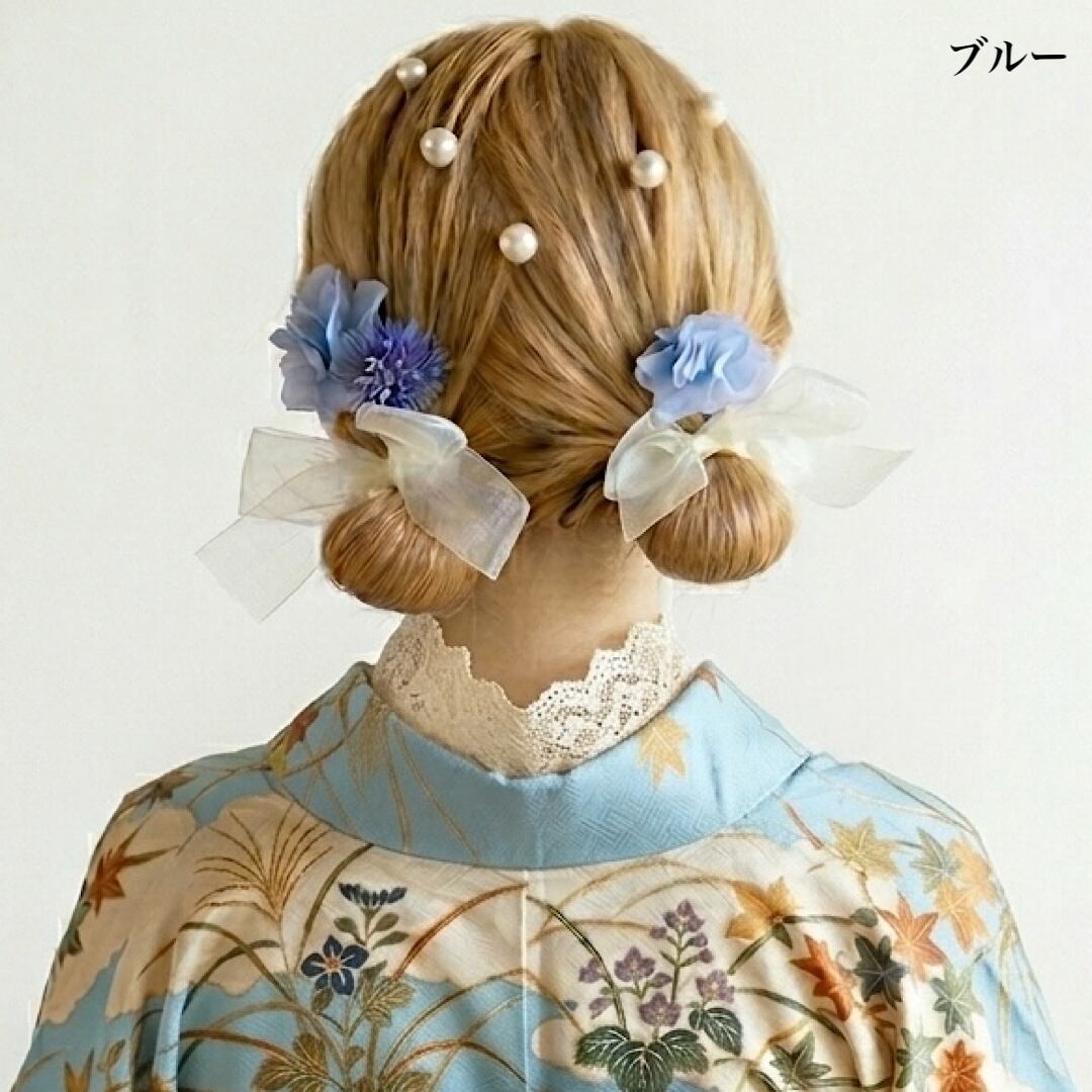 お花とリボンのパール髪飾り 成人式 卒業式 結婚式 七五三 和装 ツインテール 成人式髪飾り 卒業式髪飾り 結婚式髪飾り 七五三髪飾り