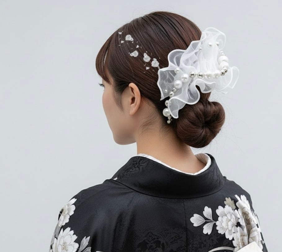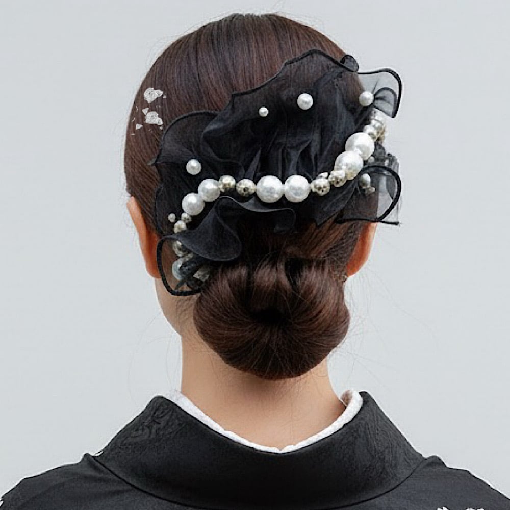 シルバーミックスパールチェーンとフワフワパールリボンの髪飾り 成人式 卒業式 結婚式 成人式髪飾り 卒業式髪飾り 袴 白無垢 水引き 水引き髪飾り 七五三