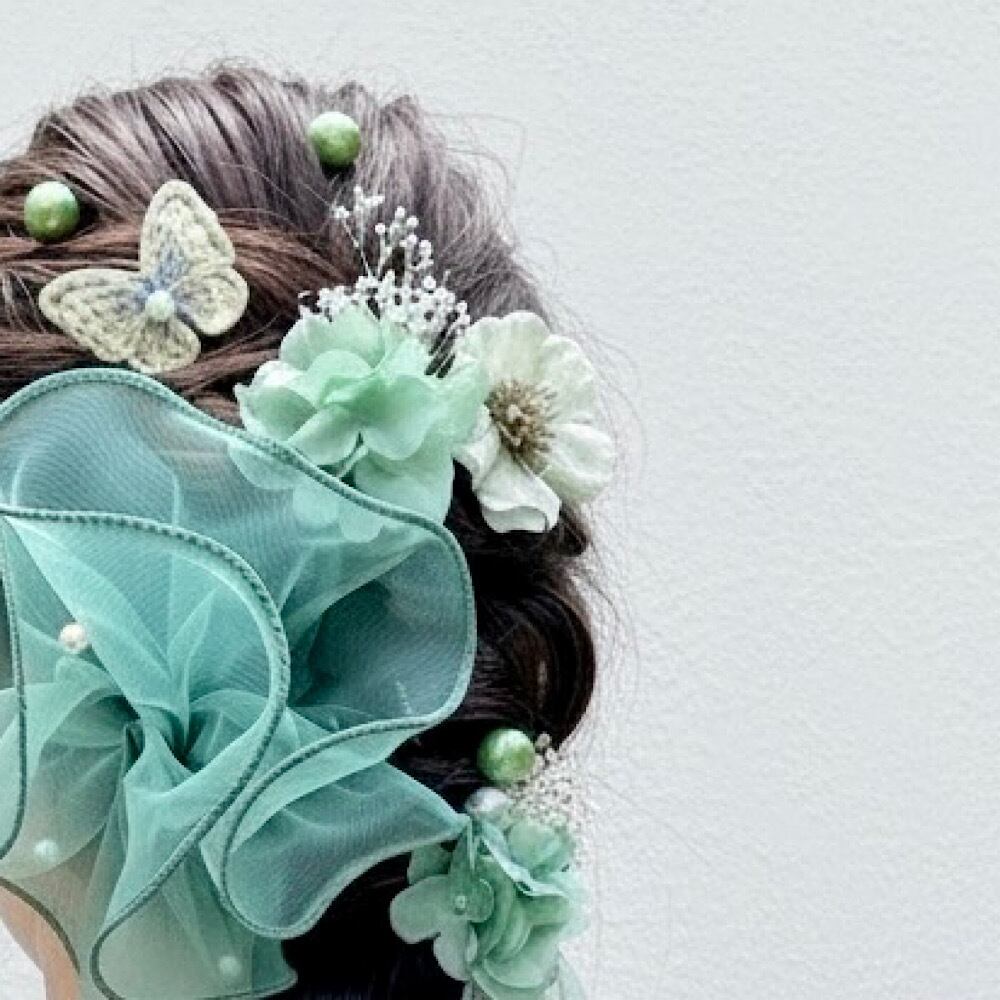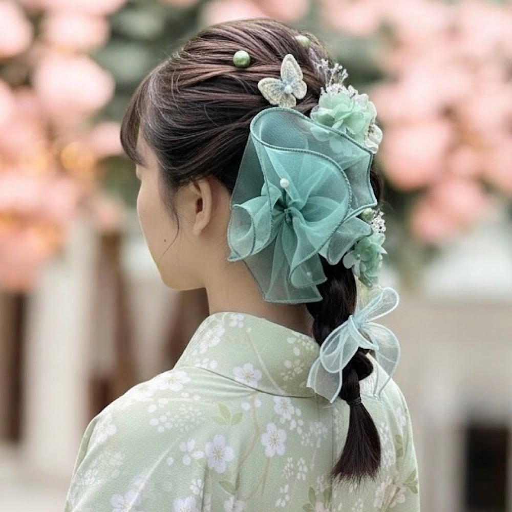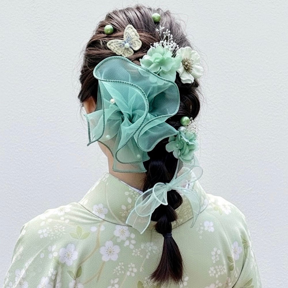 フワフワパールリボンと蝶々の髪飾り グリーン髪飾り 緑 成人式 結婚式 卒業式 前撮り 七五三 ヘッドパーツ ヘッドドレス