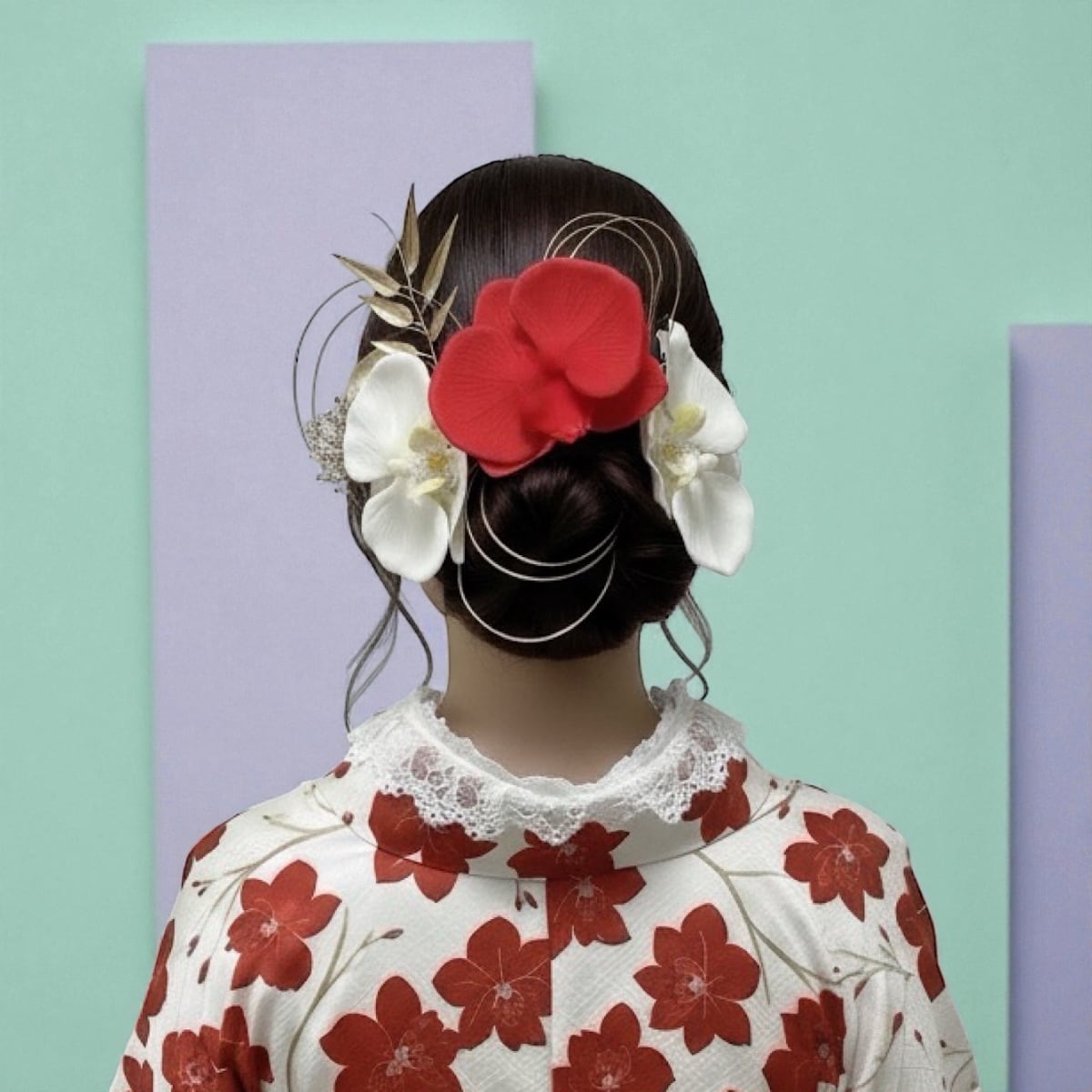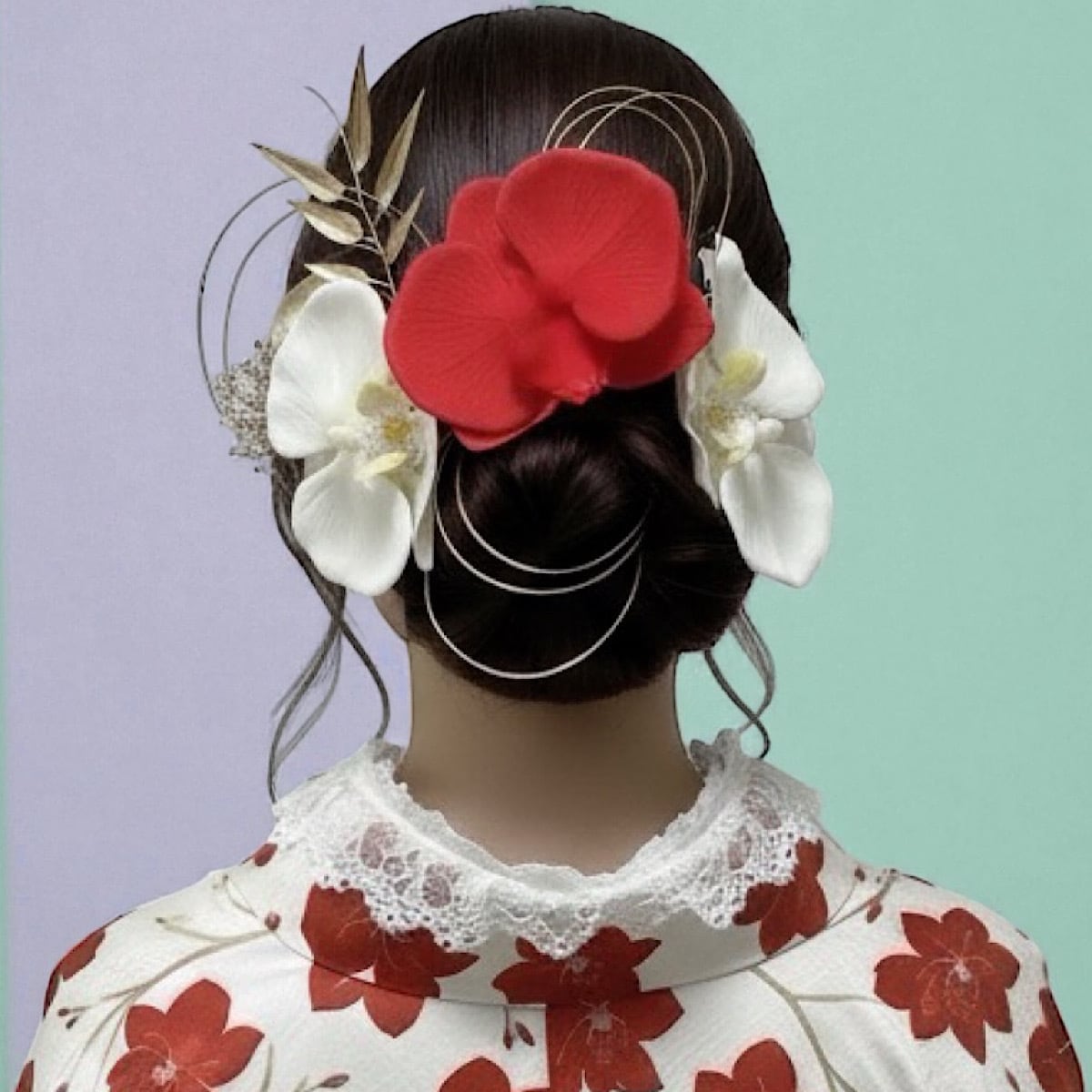 トリプル胡蝶蘭髪飾り レッド&ホワイト 成人式髪飾り 卒業式髪飾り 結婚式髪飾り 成人式 卒業式 結婚式