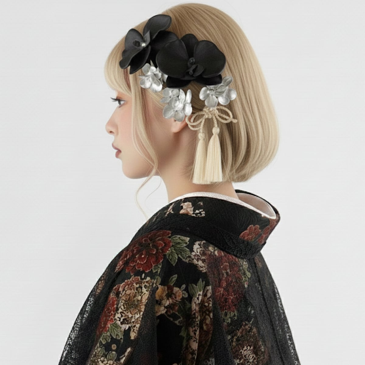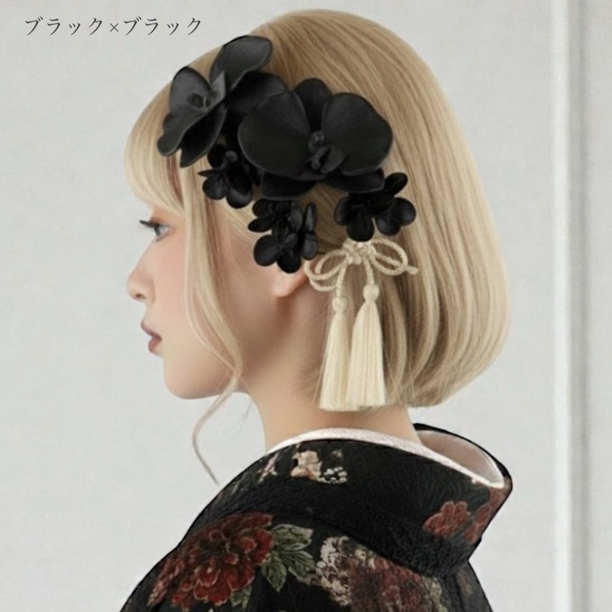 ブラック胡蝶蘭とタッセル髪飾り 成人式髪飾り 卒業式髪飾り 結婚式髪飾り 七五三髪飾り