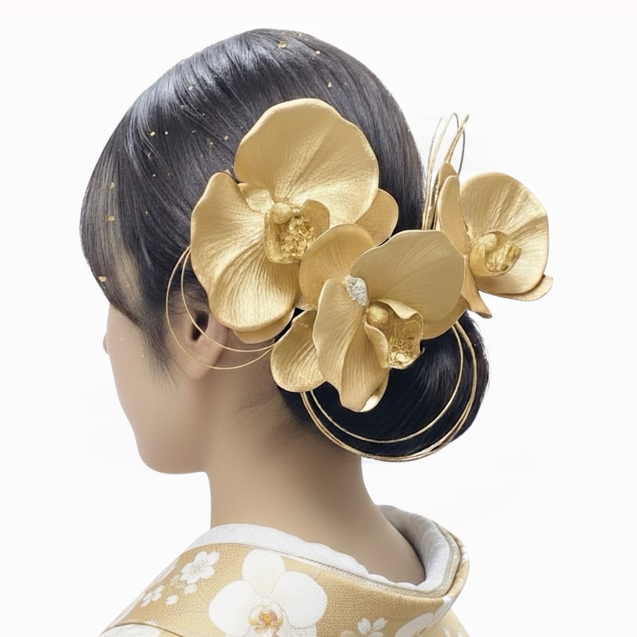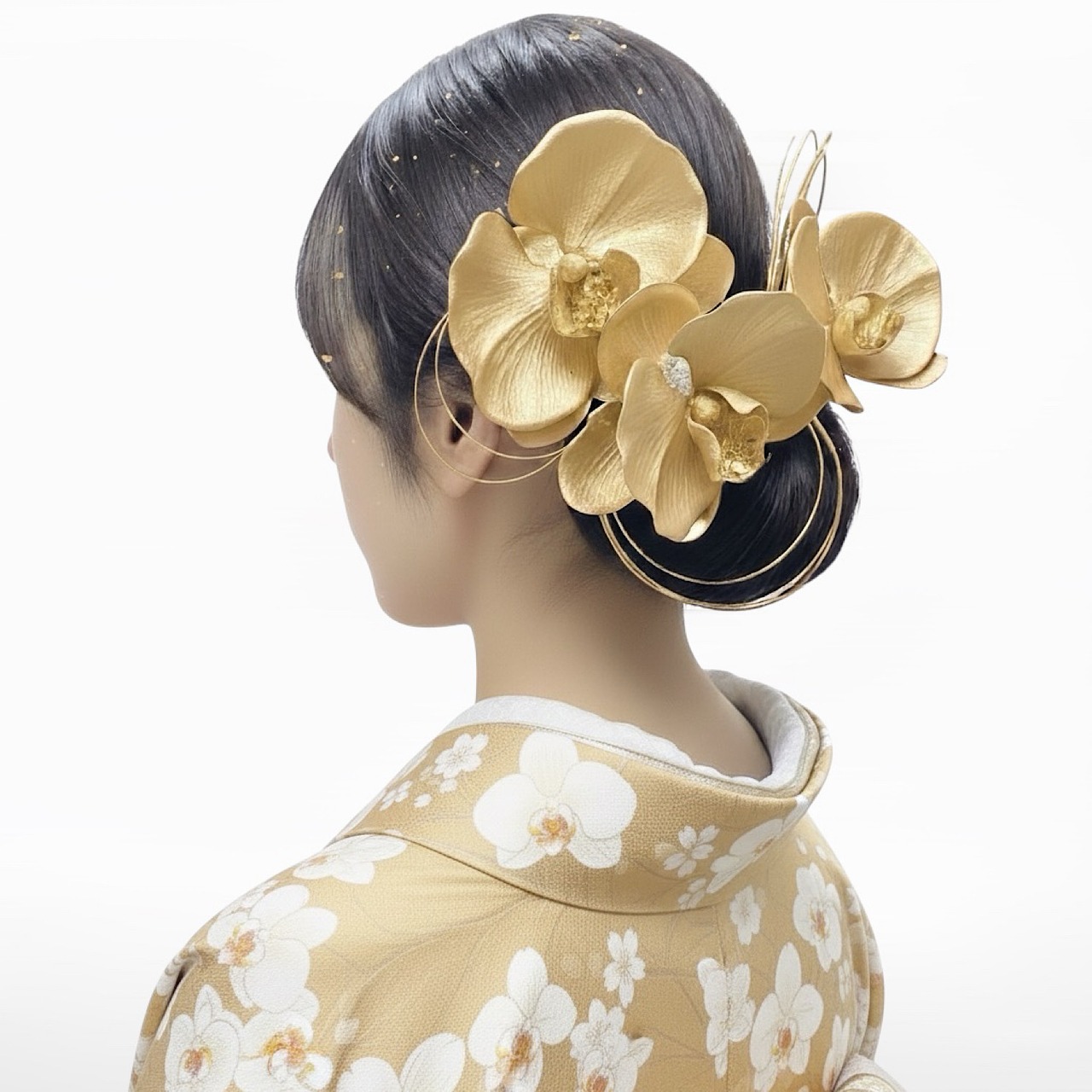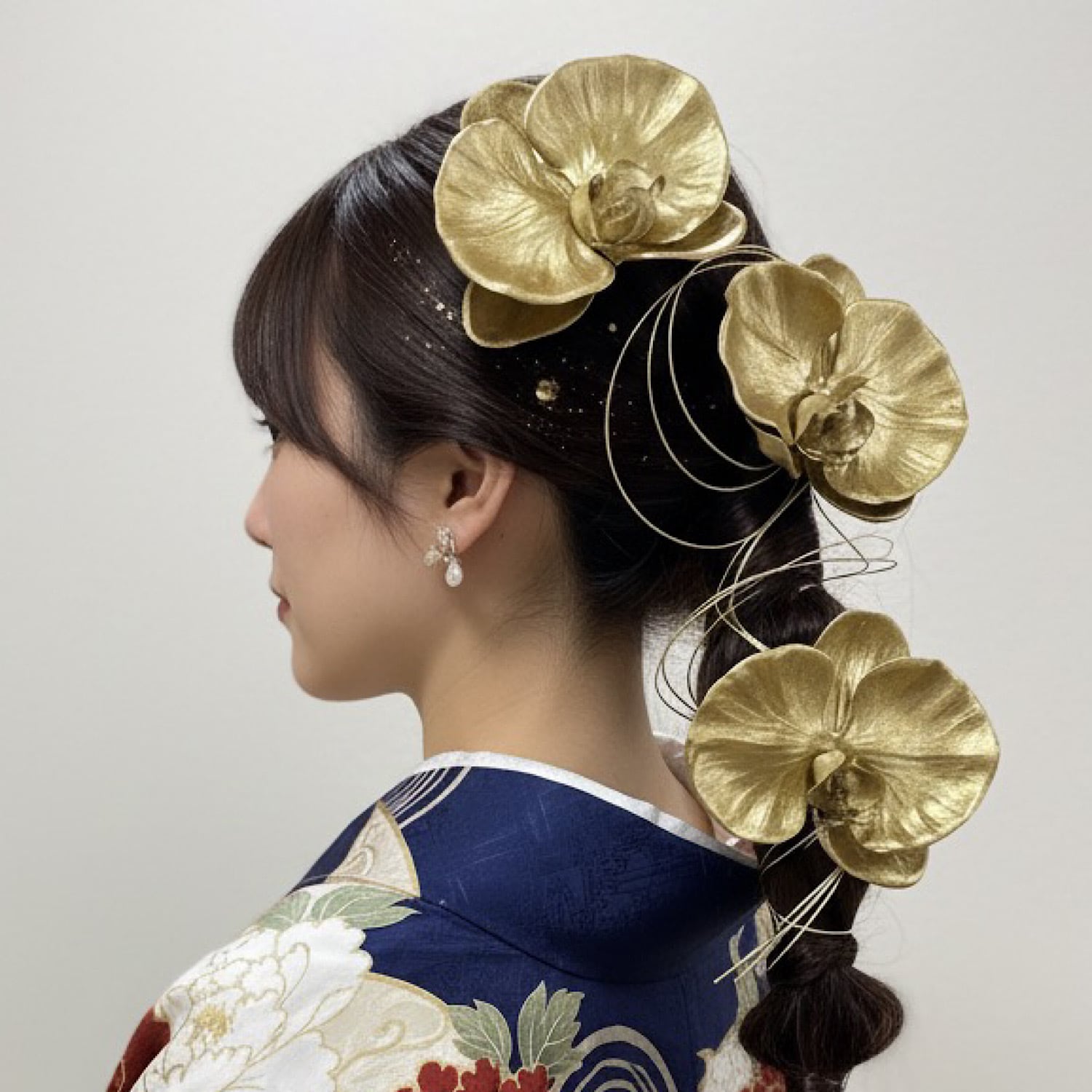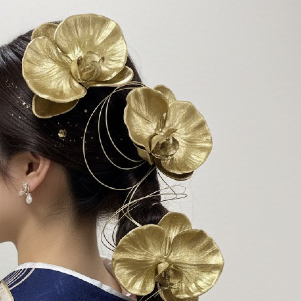胡蝶蘭トリプル髪飾り ゴールド 成人式 卒業式 7532