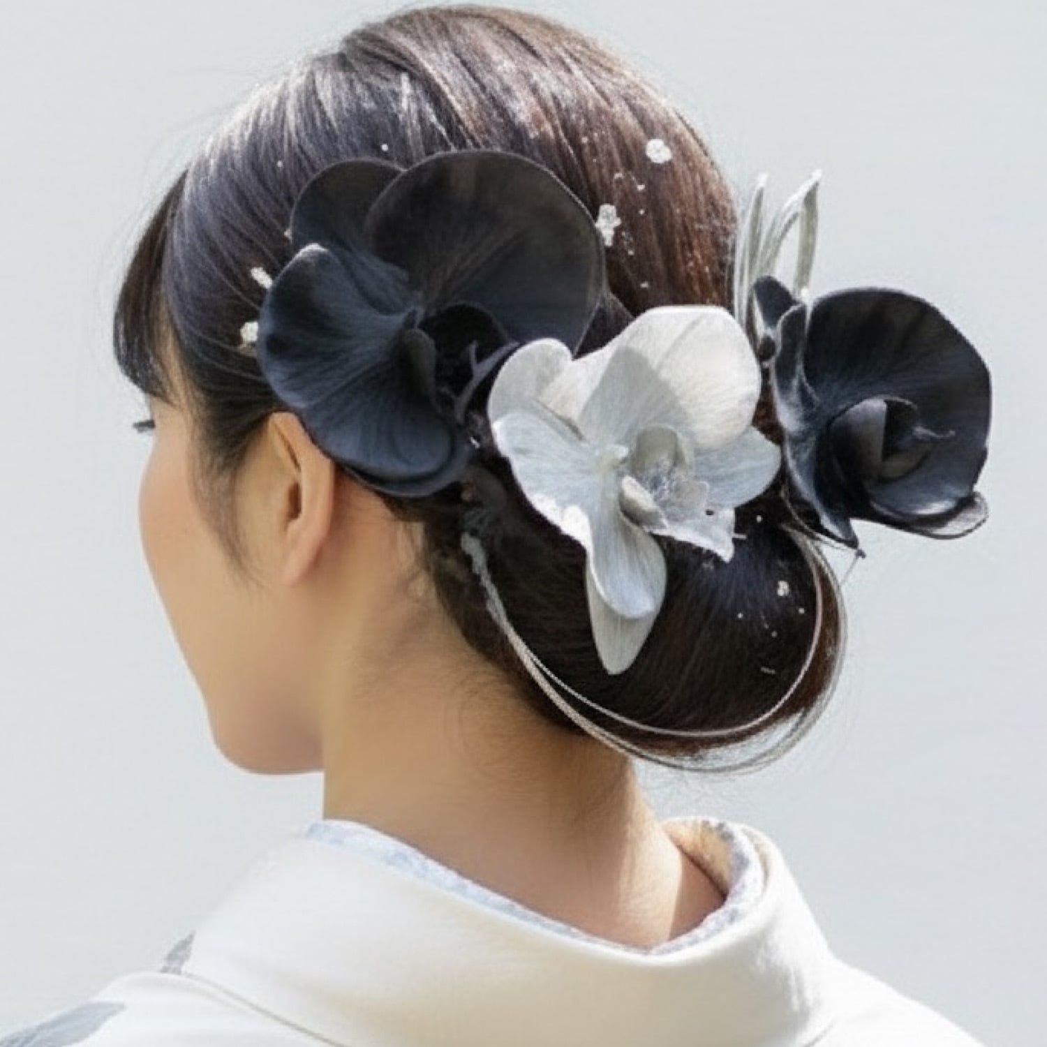 トリプル胡蝶蘭髪飾り ブラックシルバー 成人式 成人式髪飾り 卒業式