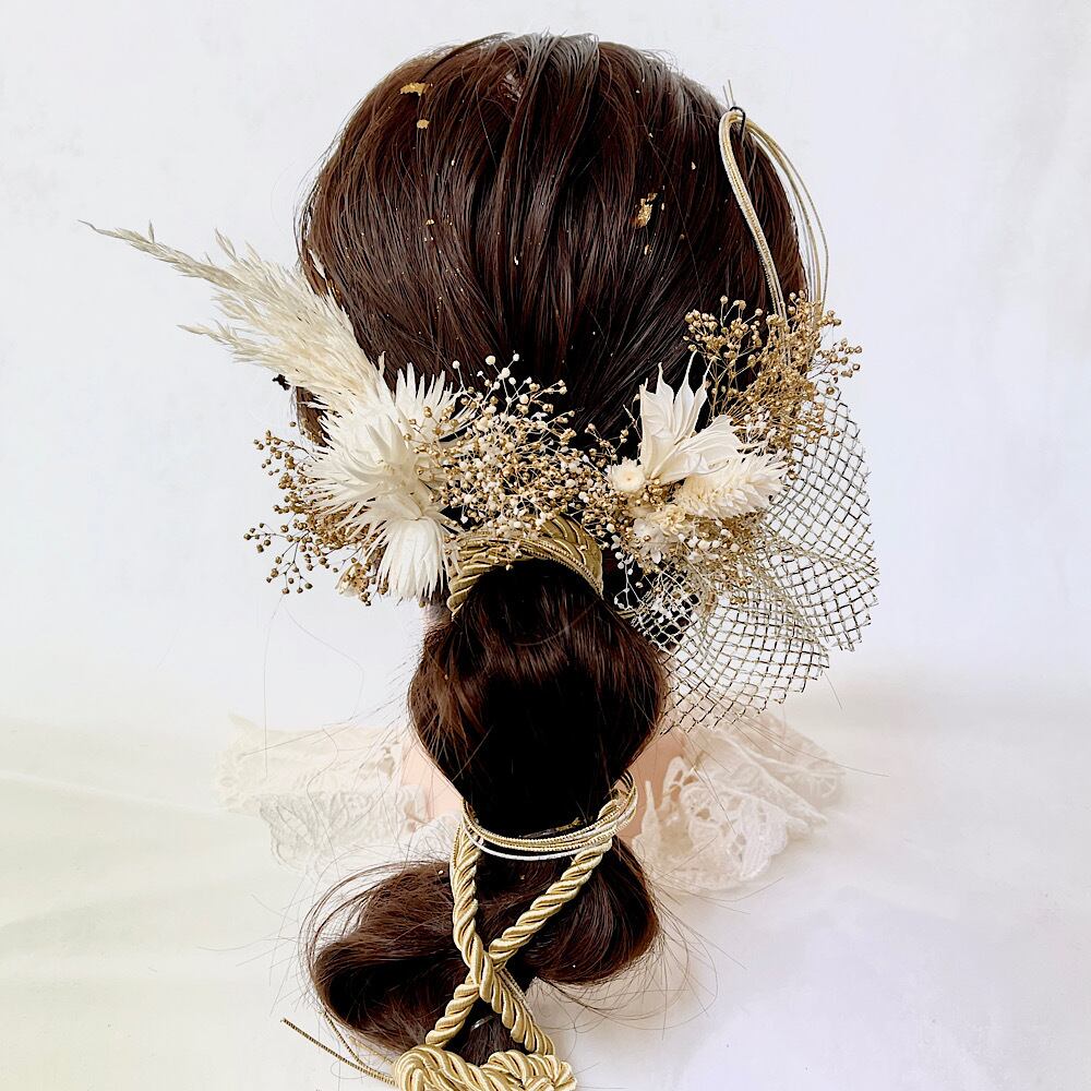 水引き髪飾り ナチュラルカラー 水引髪飾り ホワイト×ゴールド 編みおろし髪飾り 水引きアレンジ ナチュラル髪飾り 水引き 紐髪飾り 成人式髪飾り 卒業式髪飾り 結婚式髪飾り ヘッドパーツ
