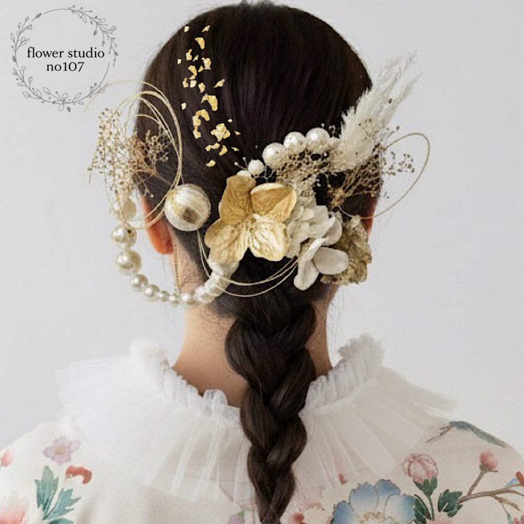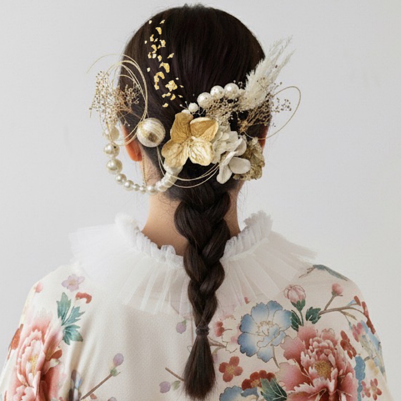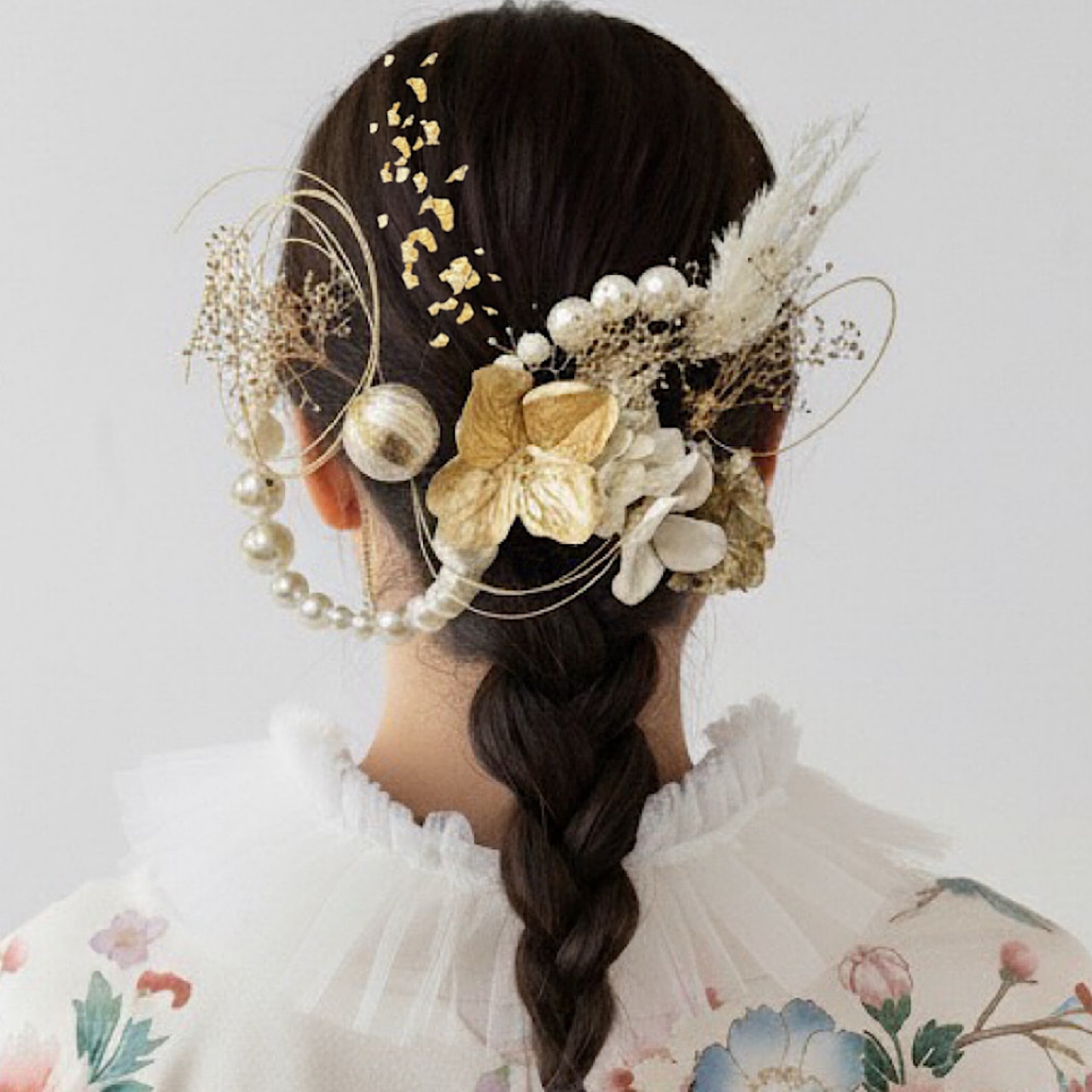 こちらの髪飾りはランダムパールチェーンと水引をアクセントに柔らかい印象に仕上げる為、プリザーブドフラワーとアーティフィシャルフラワーをミックスしどこか可愛らしくも上品さを感じさせるデザインに仕上げました。