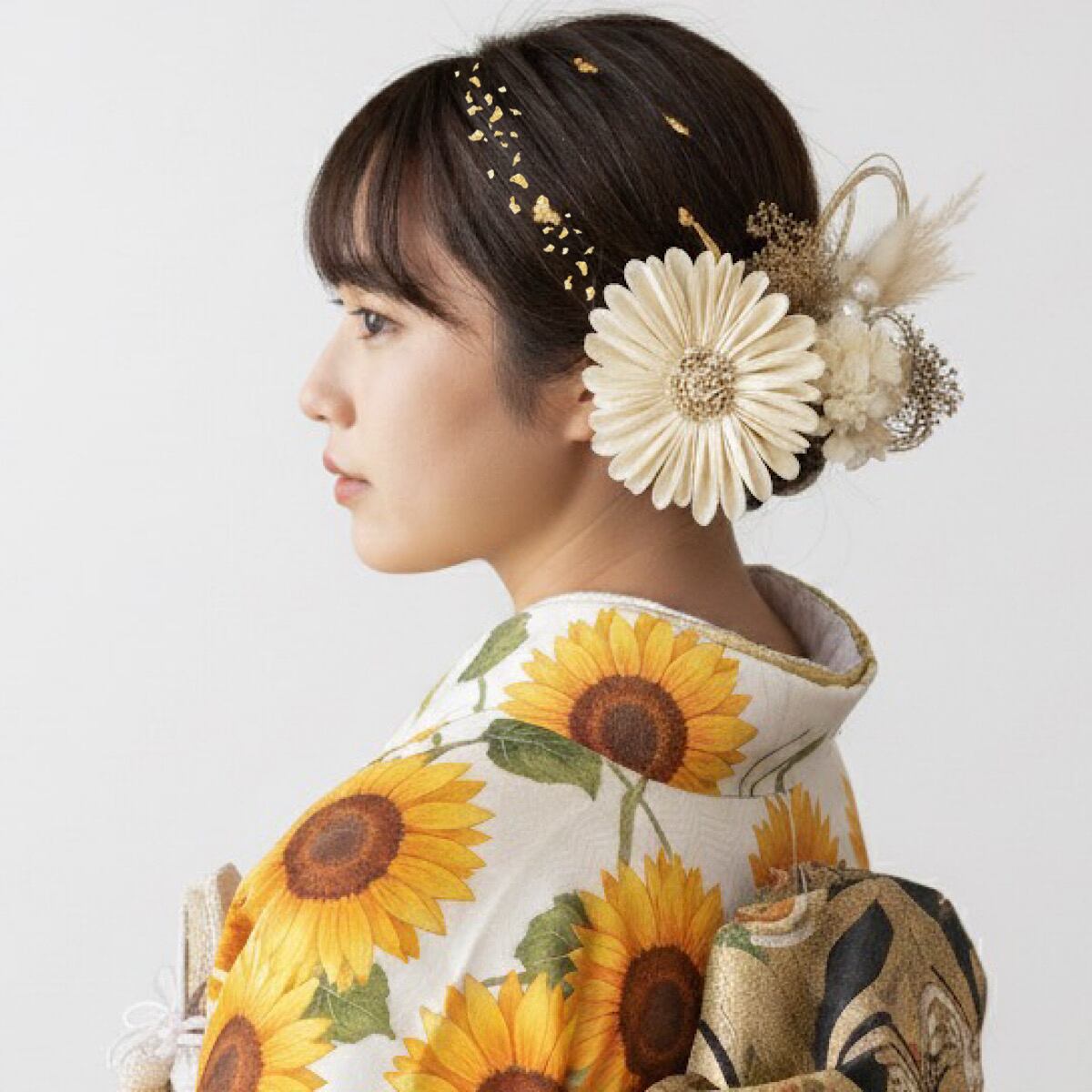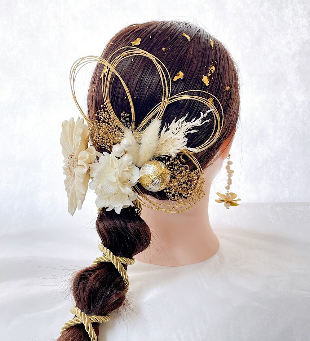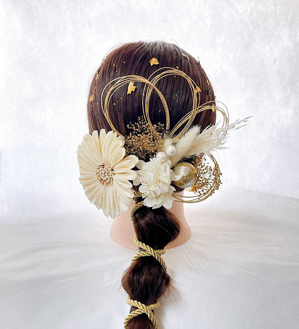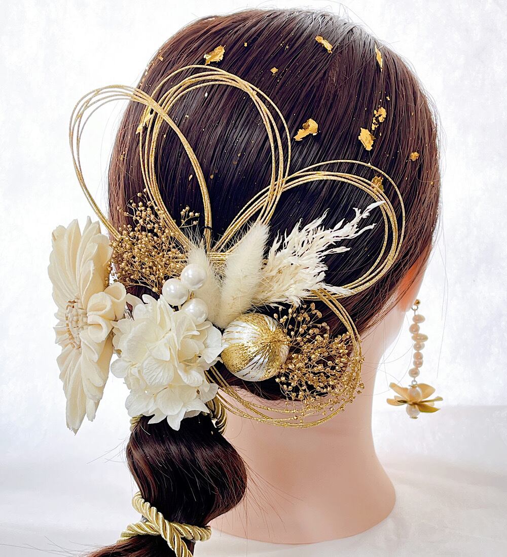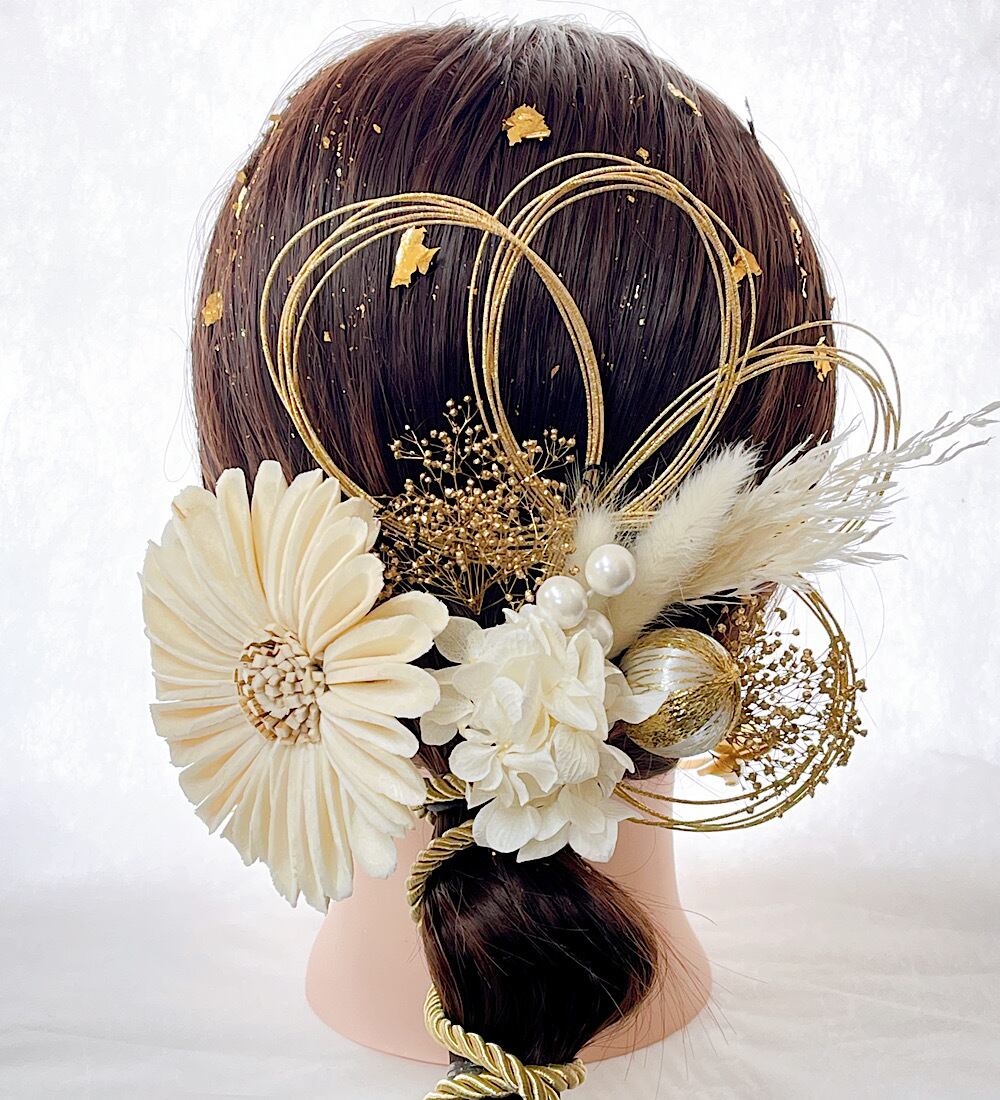 成人式 ひまわり 髪飾り 白 卒業式 結婚式 水引き 水引き 金箔 七五三 和玉 成人式髪飾り 卒業式髪飾り 結婚式髪飾り 紐アレンジ ひまわり髪飾り 和装