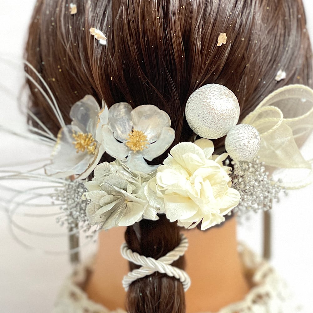 成人式 & 結婚式 髪飾り クリアフラワー シルバー&ホワイト 和装 ウェディング 卒業式 アメリカンフラワー ヘッドドレス 水引