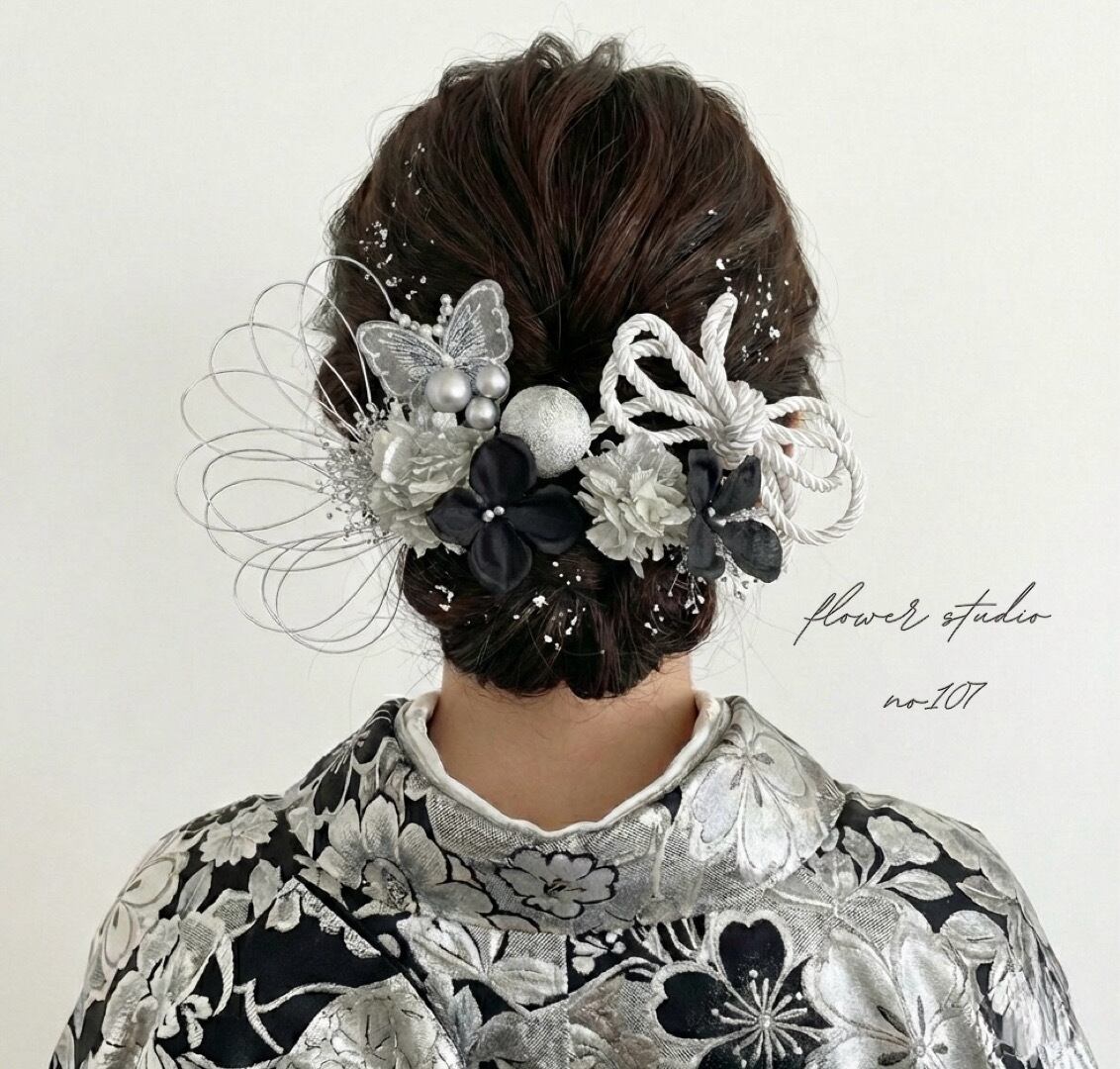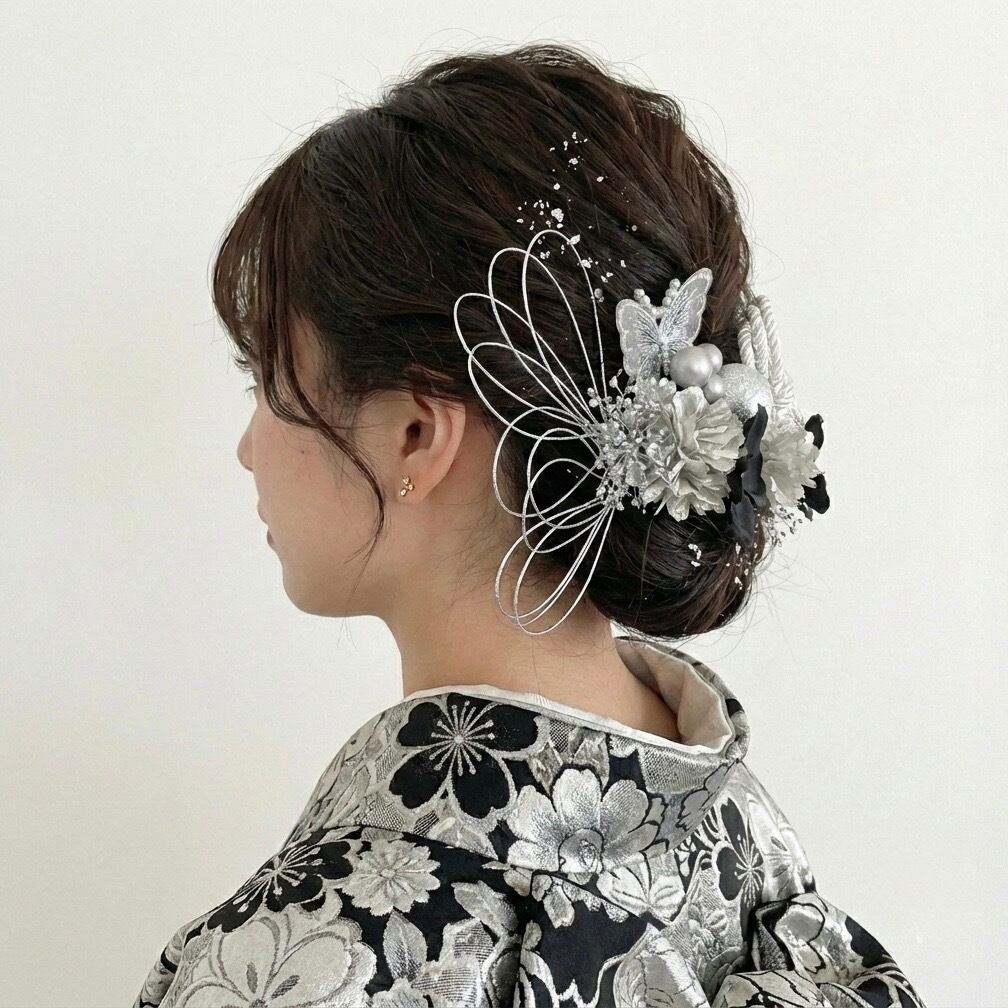 成人式 & 結婚式 シルバーブラック蝶々髪飾り 和玉 紐アレンジ 金箔 水引きアレンジピン かすみ草 成人式髪飾り 結婚式髪飾り 前撮り 和装 はたちのつどい 水引