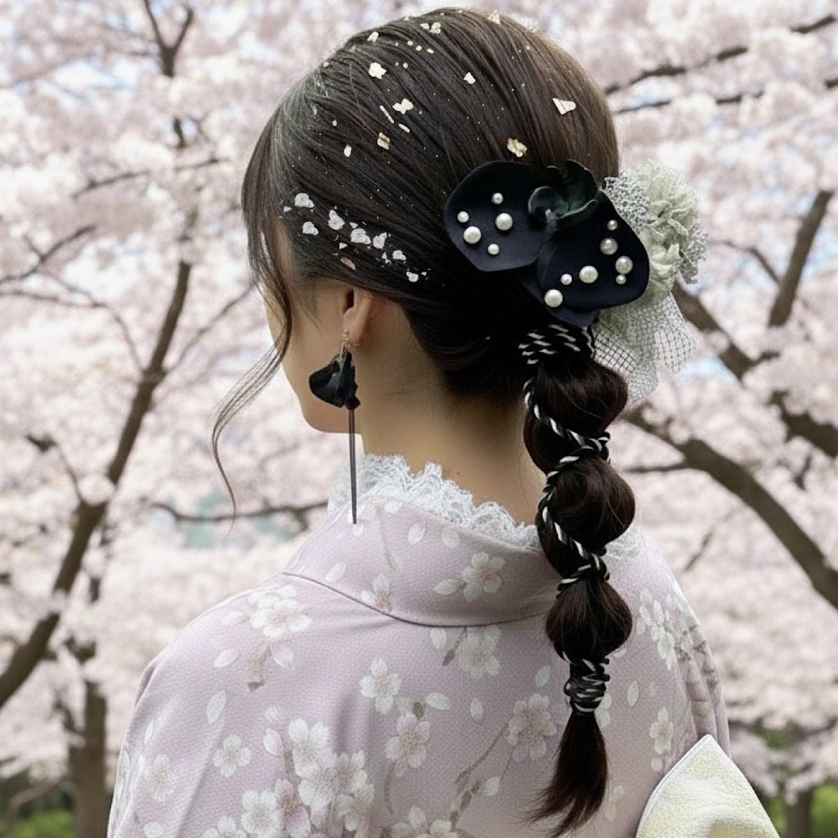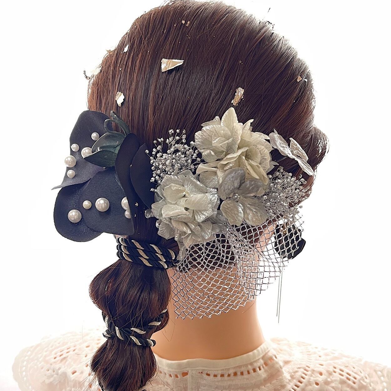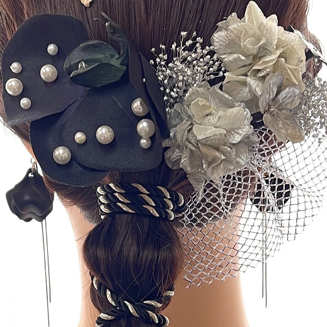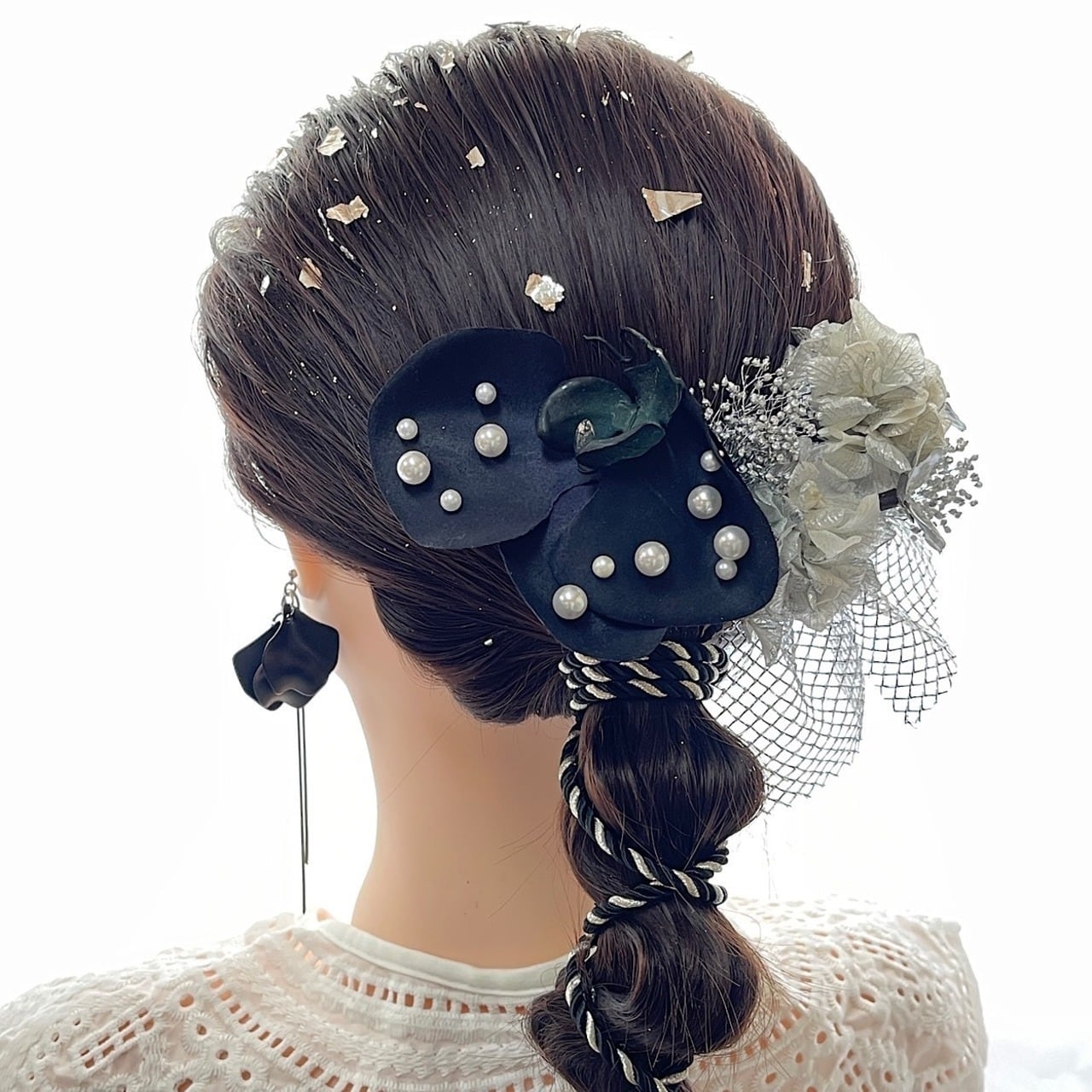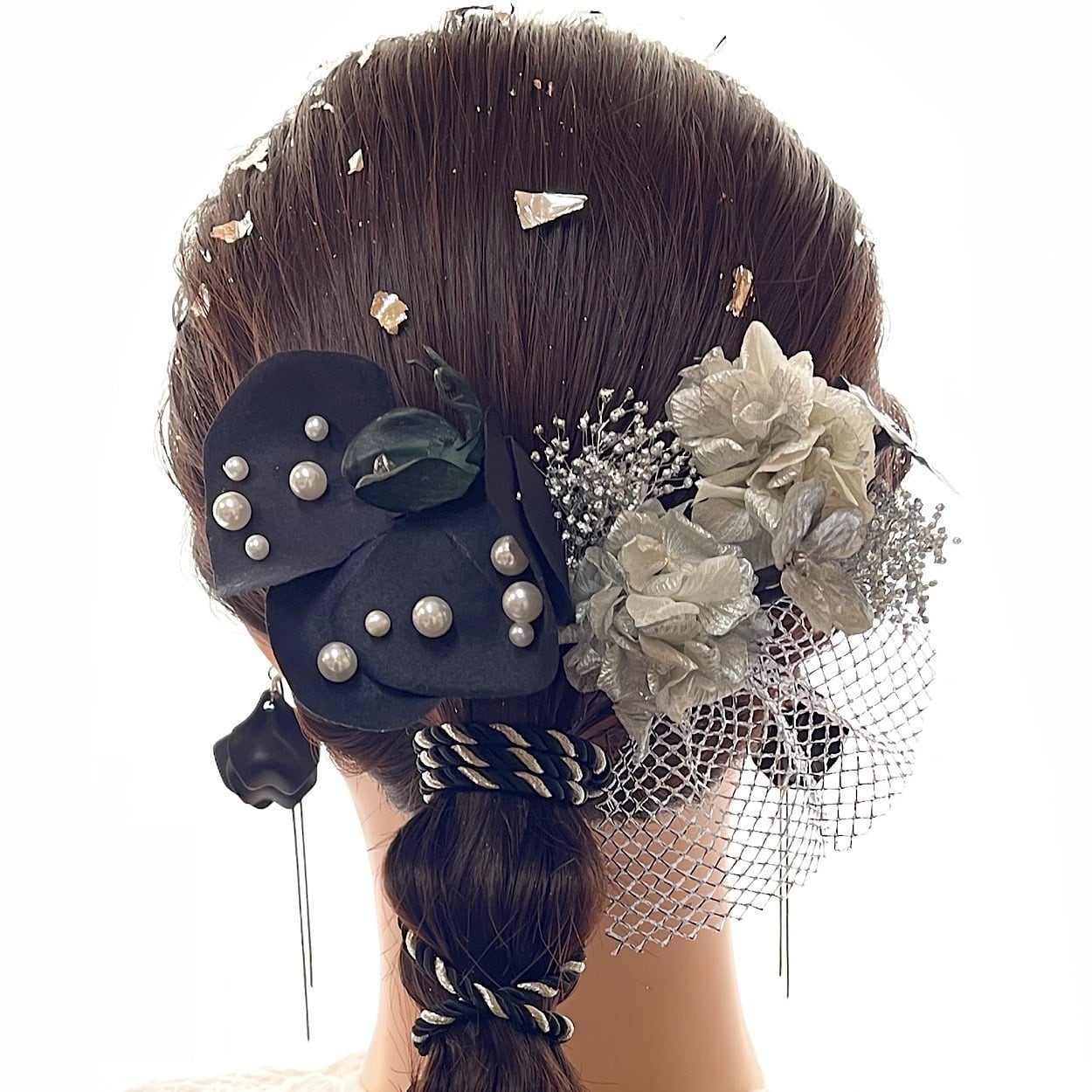 どこかクールな印象のブラック胡蝶蘭をトレンドのパールを施し、和装でもドレスでも着用いただけるようにデザイン致しました♪