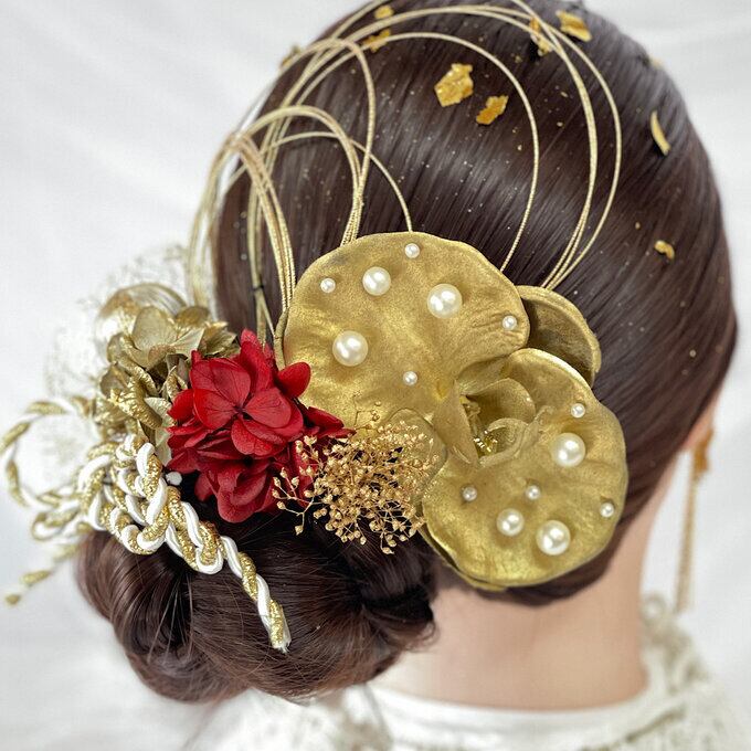 ゴールド胡蝶蘭をトレンドのパールを施し、和装でもドレスでも着用いただけるようにデザイン致しました。