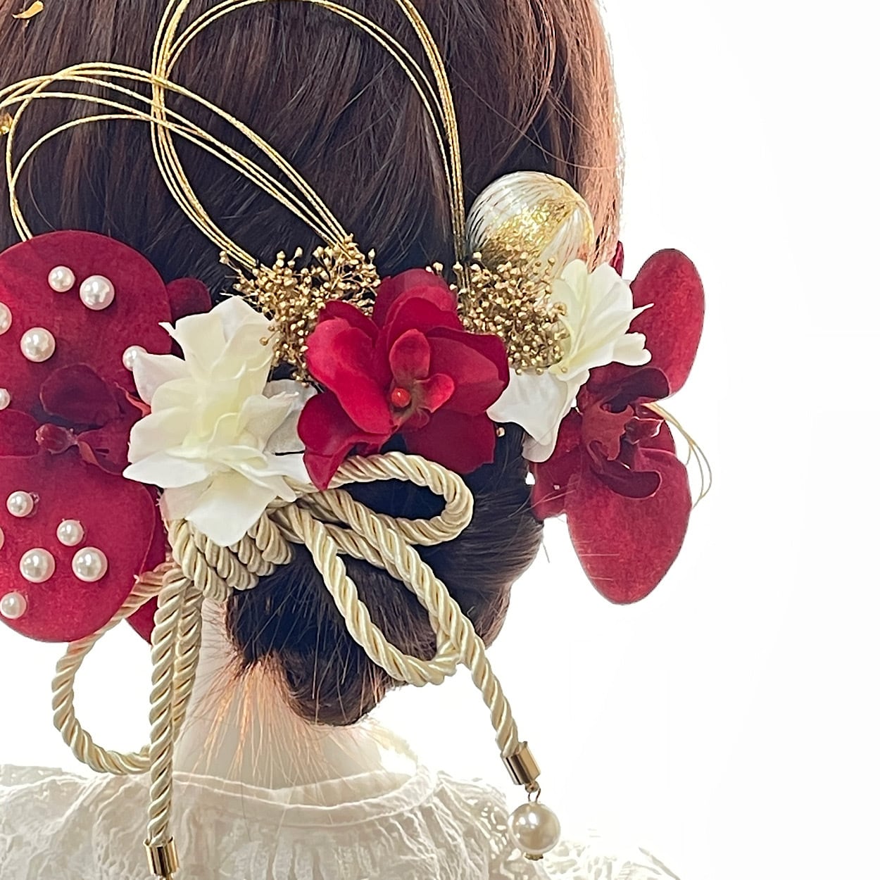成人式 & 卒業式 & 結婚式 パール胡蝶蘭 レッド髪飾り 髪飾り 水引 アレンジ紐 成人式髪飾り 卒業式髪飾り 七五三 結婚式 卒業式 和装 前撮り 後撮り