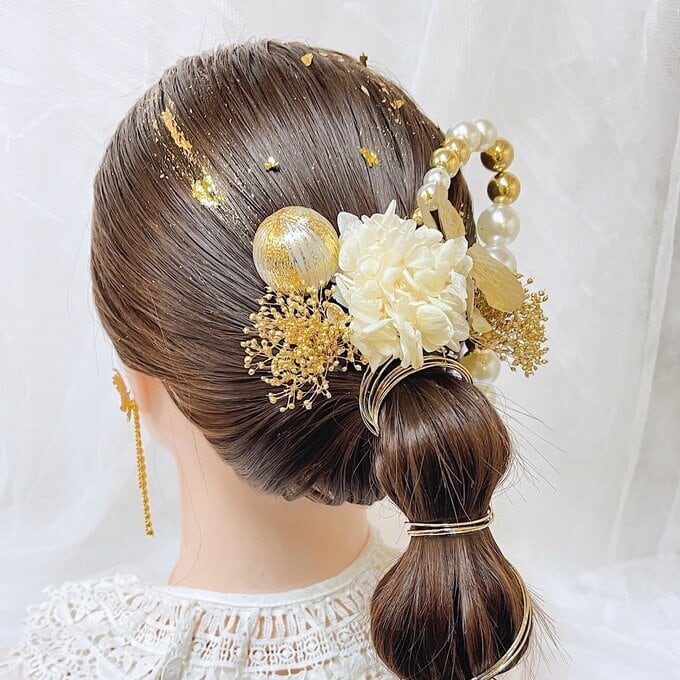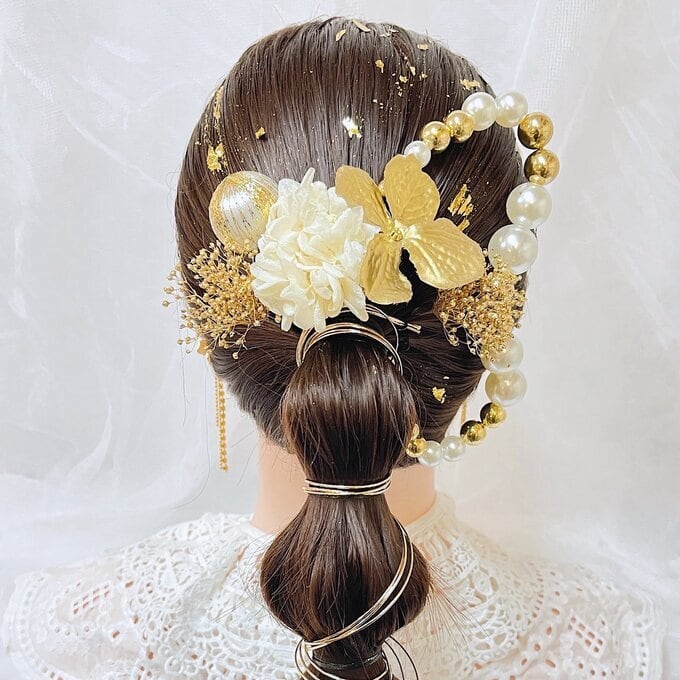 成人式 卒業式 髪飾り ゴールドパールミックス ランダムボールチェーン 水引き 金箔シート 髪飾り 成人式髪飾り 七五三 結婚式 和玉 卒業式髪飾り 紐アレンジ ヘッドパーツ