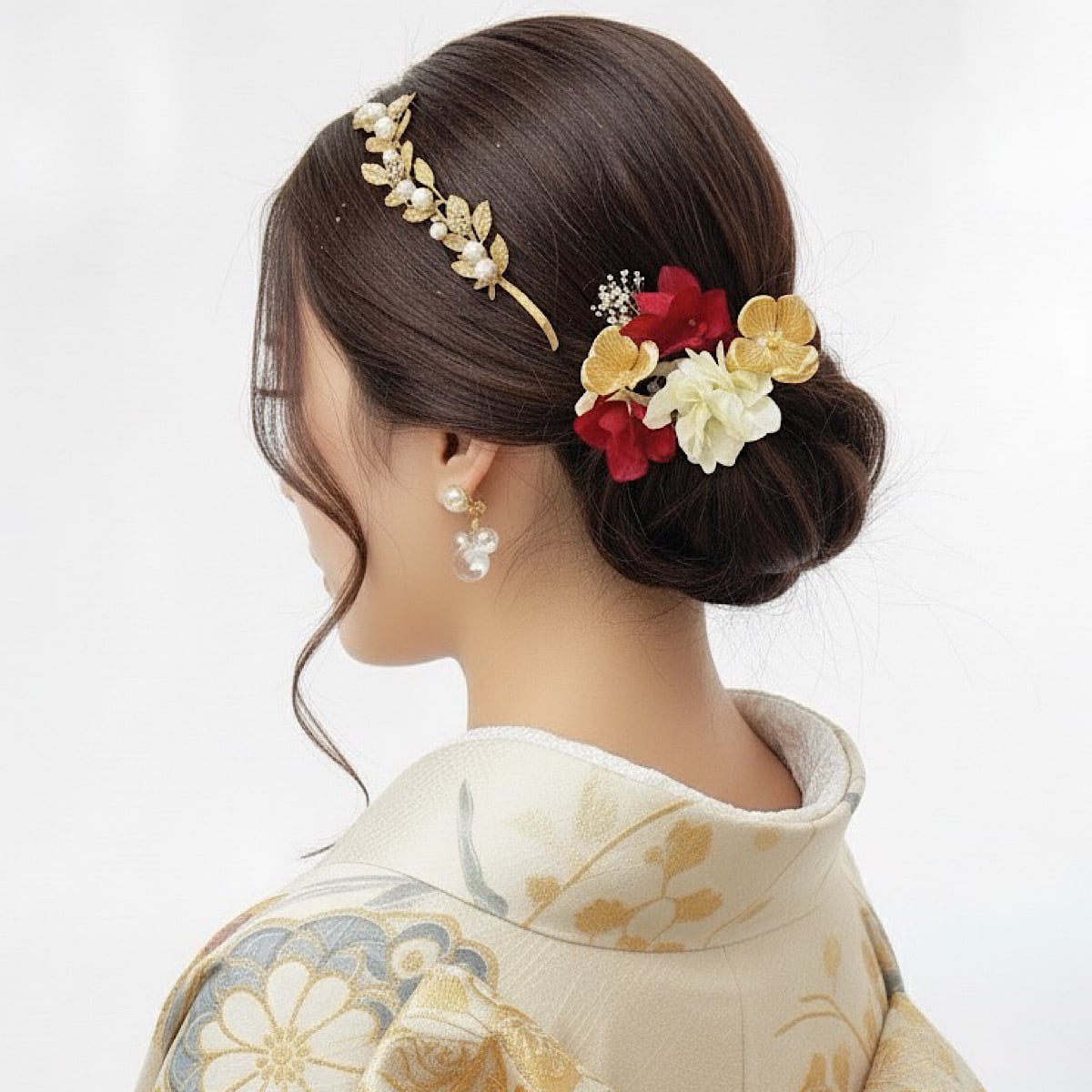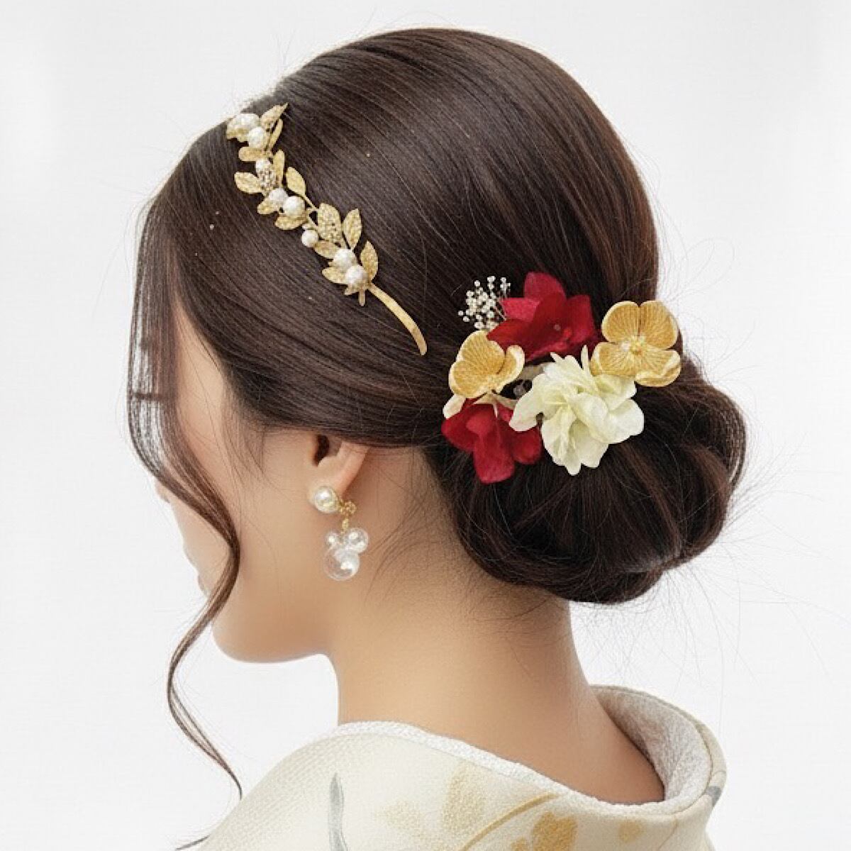 成人式髪飾り ホワイトゴールドレッドミックス カチューシャとお花の髪飾り 成人式 卒業式 結婚式 和装からドレスまで