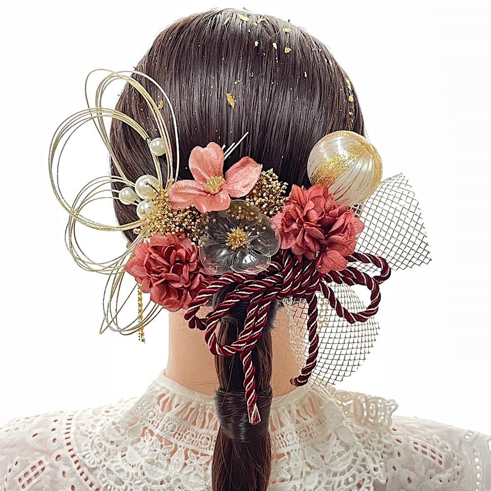 成人式 髪飾り お花とパールの水引き髪飾り ローズピンクゴールドミックス クリアフラワー 和紐 アレンジ 紫陽花 プリザーブドフラワー