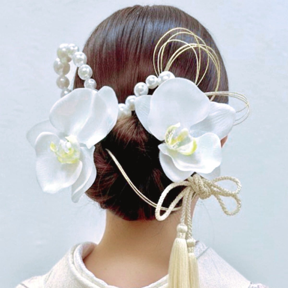 胡蝶蘭とパールチェーンのタッセル髪飾り 成人式 卒業式 結婚式 七五三 髪飾り